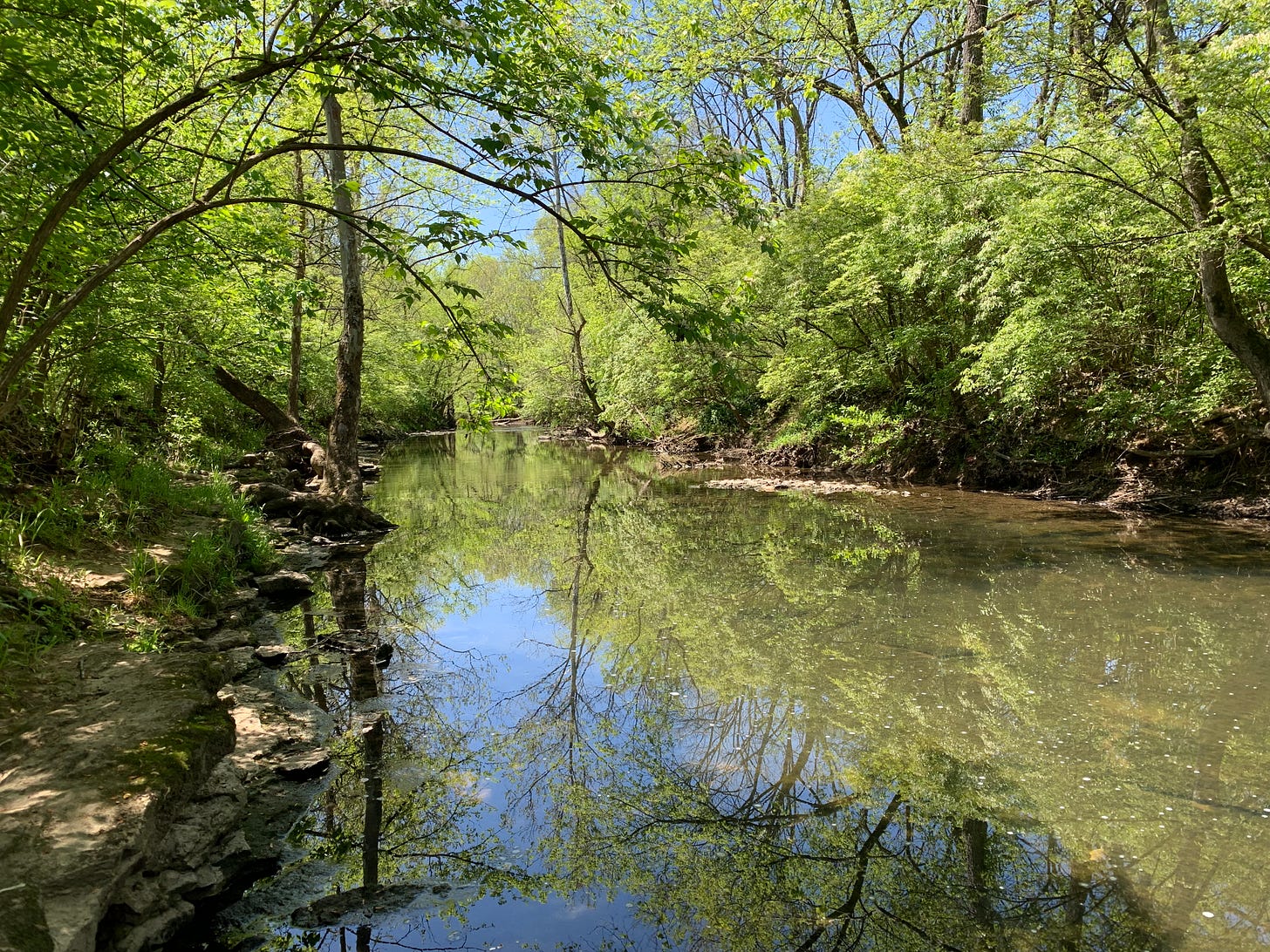 Creek: a concept my eyes skim across like a too-familiar word. Brown thing, wet thing. I almost walk past the thing, but blue on brown catches my eye, catches my breath— there is sky on the water, and a fish is breaking free of clouds, his silver belly its own sun. He jumps, splashes, shatters creek, shatters sky.