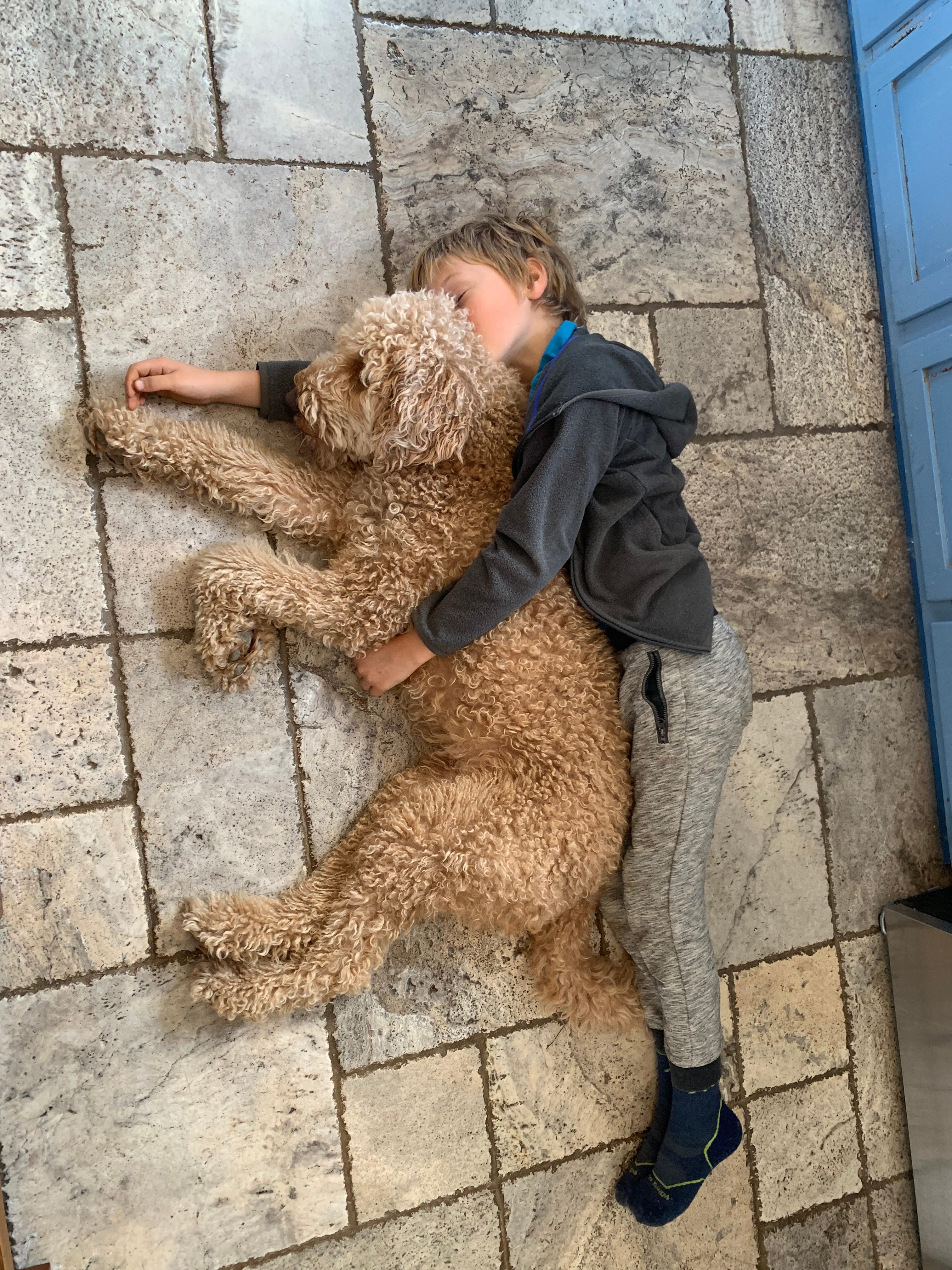 Jeff and my son, snuggled like spoons. My version of the American dream includes all of us grown-ups becoming a little more like children and dogs.