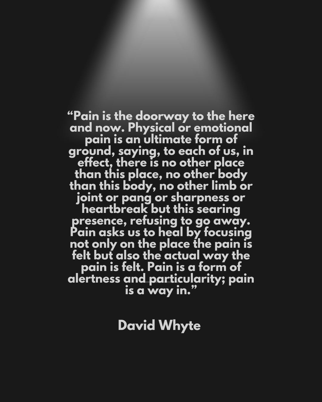 Staying there, feeling the pain all the way and with all the curiosity I can muster, I sometimes find it shifting into a dark hole on the back of my shoulder (or arm or wrist or all of the above). I imagine myself stepping inside it. And there I find a network of pitch-black tunnels leading every which way. I imagine these tunnels connecting me, through my pain, to every other being who is experiencing pain in that moment. I’ve felt love reaching through this black opening and down a long tunnel to sit with a frightened young woman in labor. I’ve felt love tunneling through the darkness to be with someone in the fresh and terrifying aftermath of a car accident. Then to an amputee in Gaza. Then to a parent who has just lost a child. Then to someone, anyone, who feels entirely, excruciatingly alone.