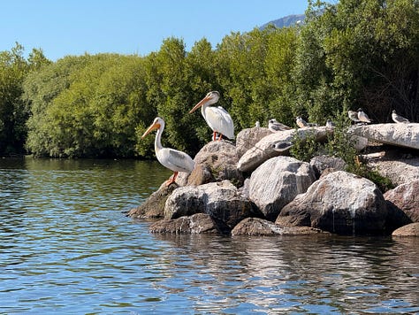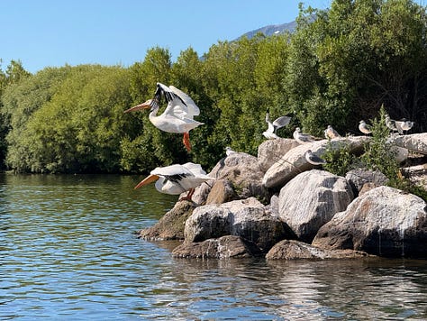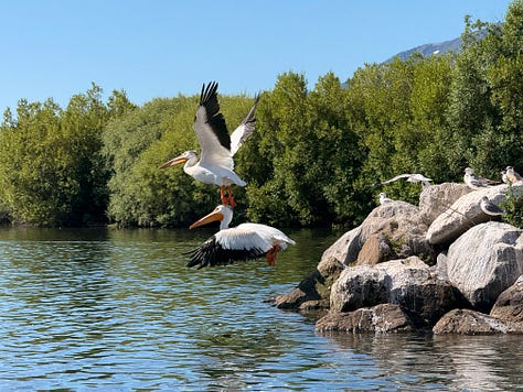 There are pelicans on the far shore, pelicans on the near shore, pelicans in the sky. Have you ever seen grace more abundant? Grace more awkward? Have you ever gawked until you felt yourself fly?